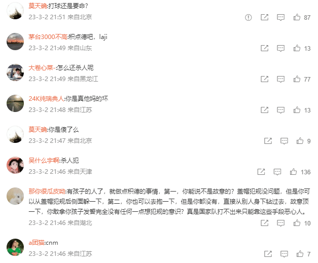 胡金秋冲上热搜第一名,他的社交媒体被攻陷,首先是胡金秋作为当事人,没有在社交媒体上道歉,他的上一条动态还是停留在庆祝农历兔年的到来。球迷们纷纷怒斥胡金秋的动作恶劣,没有做出保护对手的行为,甚至还有下压的动作,甚至还有激动的球迷怒斥:打球还是要命?