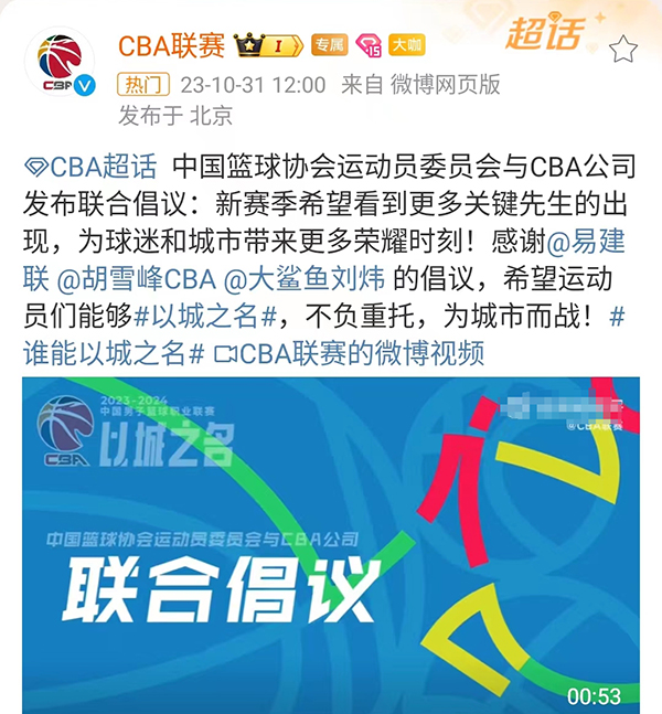 在新赛季开始后,易建联录制了“以城之名”相关的新赛季宣传视频,号召更多的球迷关注新赛季的CBA,一起关注CBA的成长,值得一提的是,在接下来的CBA活动,包含CBA全明星赛等活动,易建联也会出现在活动上继续为推广CBA做出自己的贡献,不得不说,这一次CBA及时邀请回易建联的决定无疑是及时、最好的决定。
