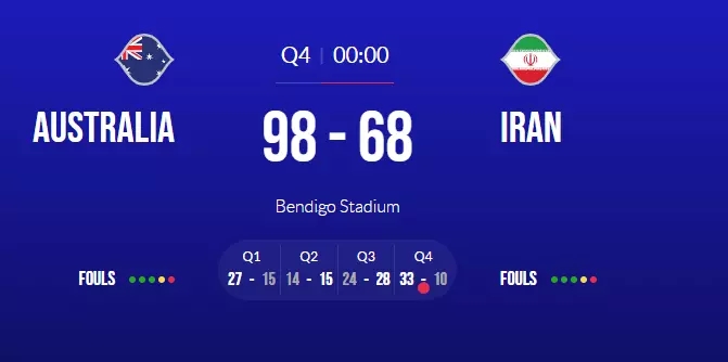 次节,澳大利亚继续扩大领先优势,第二节比赛还剩下6分钟时,澳大利亚已经手握17分领先优势,37-20领先。随着,伊朗队抓住澳大利亚防守松懈的短板,在上半场结束前,将分差缩小一点,半场以30-41落后澳洲。