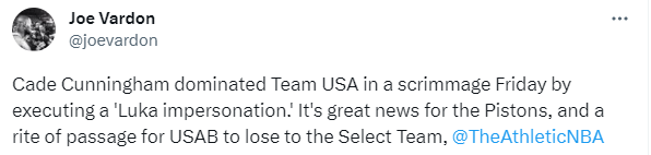 名记Joe Vardon表示坎宁安在陪练队中模仿东契奇,带队击败美国男篮,对于活塞来说,这是一个好消息,对于美国男篮来说,输给陪练队算是一种成人礼。