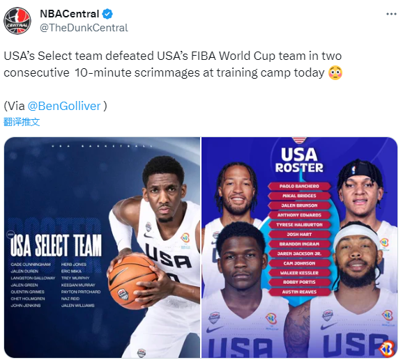 来源:JRS直播网08-05 09:40JRS直播网讯讯08月05日,美国男篮世界杯正牌军输给了陪练队,而且连续两次输球,据记者Ben Golliver报道,美国男篮世界杯正赛球队连续2场在每场10分钟的对抗赛中输给了陪练队,陪练队的坎宁安表现最出色,名记透露他有望进入世界杯大名单。