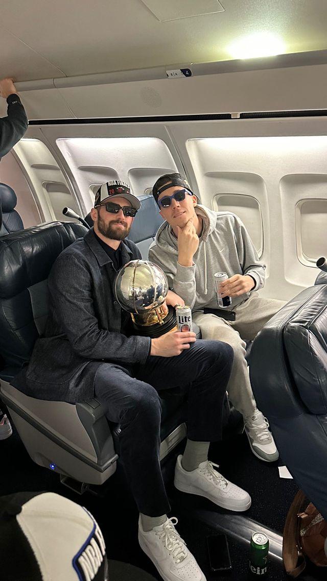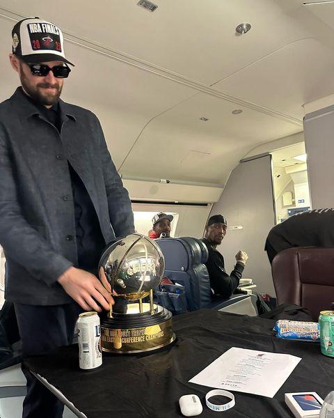 目前热火众将已经飞往丹佛,马丁抱着东部冠军奖杯、戴着东部冠军帽并且把荣誉T恤搭在肩膀上,一脸严肃十分霸气;洛瑞咧嘴大笑,乐福面带笑容抚摸奖杯,阿德巴约等人扭头偷看;乐福还和邓罗合影留念,他们在飞机内喝酒庆祝,从现场画面可以看出,热火队内氛围特别好。