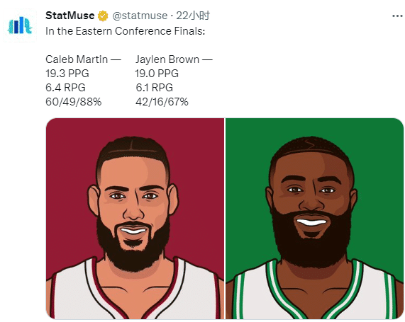 在东决系列赛,年薪只有650万美元的马丁打出亿元球星的身价,东决场均拿到19.3分6.4篮板,三项命中率60%、49%和88%;五项数据都比绿军亿元球星杰伦-布朗的表现更好,布朗东决场均19分6.1篮板,三项命中率42%、16%和67%。