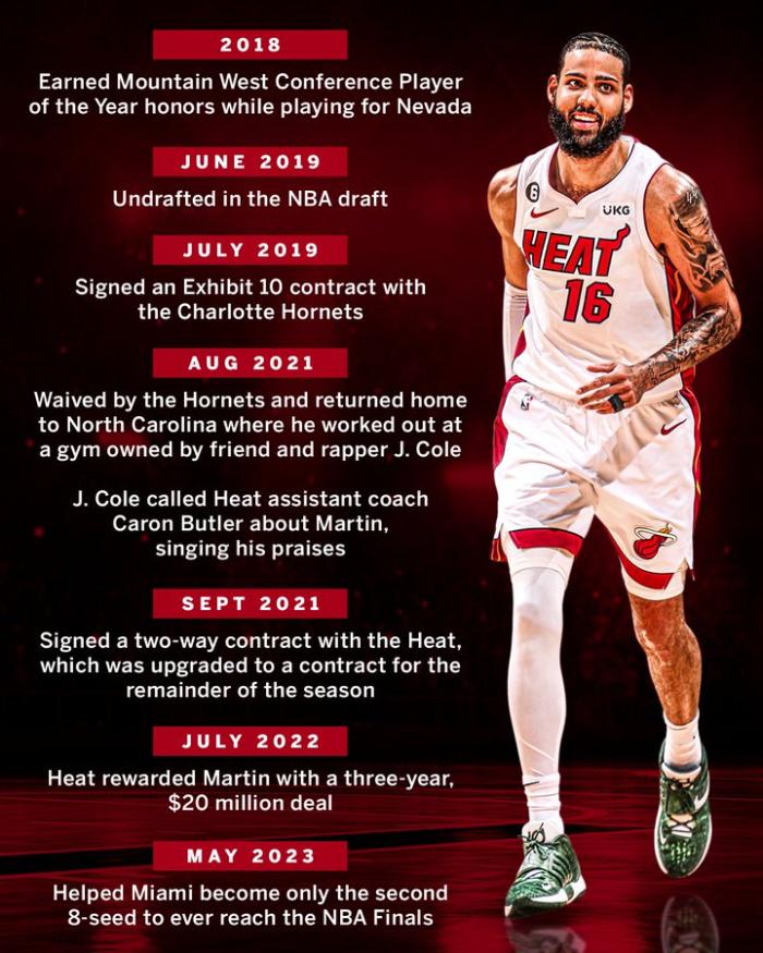 从落选秀到10天短合同再到双向合同,2021被黄蜂裁掉,之后在J-Cole的举荐下,马丁热火签下双向合同,去年夏天赢得一份3年2000万美元的保障合同,今年他在季后赛帮助热火创造历史——史上第二支黑八晋级总决赛的球队。