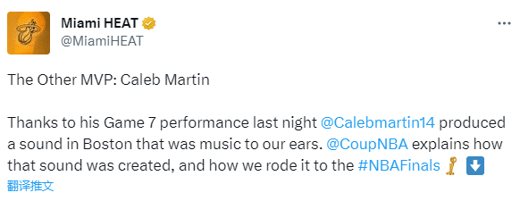 马丁获得4张东决MVP选票,仅比巴特勒少了一张选票,遗憾无缘东决MVP,不过马丁已经打出名堂,打出小人物的励志故事,热火官推盛赞马丁是球队东决抢七获胜的另一个MVP。