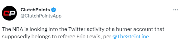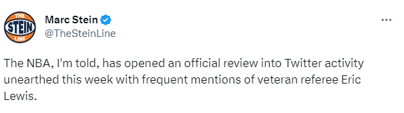 名记Stein发推写道:我被告知,NBA已经对本周发现的Twitter活动进行了官方审查,其中资深裁判埃里克-刘易斯被频繁提及。