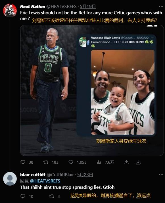 有球迷晒出刘易斯身穿凯尔特人球衣的P照,并且写道刘易斯不该继续吹罚凯尔特人的比赛,其疑似小号回应:这特么都是假的,别再传播谣言了,滚远点。