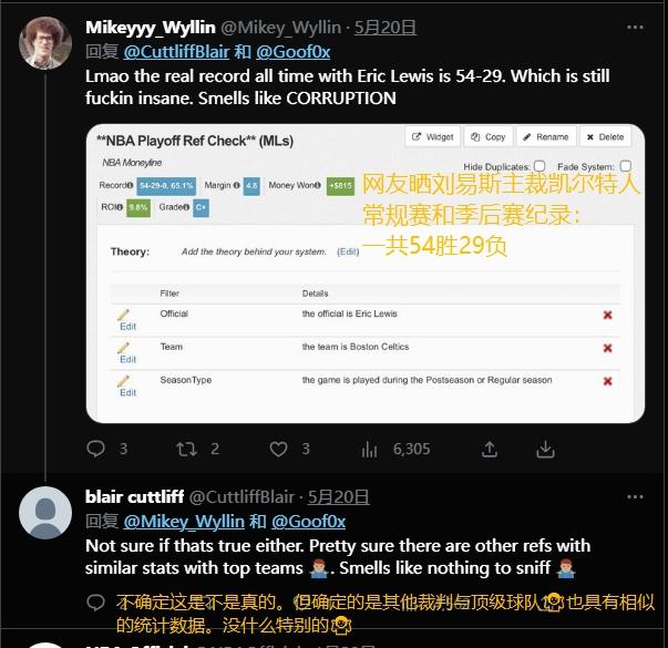 有球迷表示刘易斯吹罚凯尔特人比赛时,凯尔特人54胜29负(常规赛+季后赛),刘易斯疑似小号回应:不确定这是不是真的,但确定的是其他裁判与顶级球队也具有相似的统治数据,没有什么特别的。
