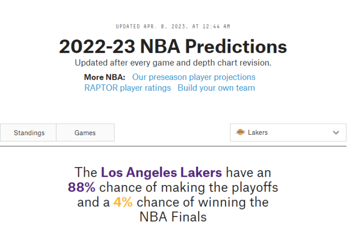 根据权威网站FiveThirtyEight最新预测,湖人晋级季后赛的概率为88%,夺冠概率为4%。