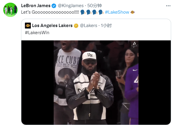 詹姆斯发推转发湖人庆祝胜利的动态,写道:让我们冲啊!