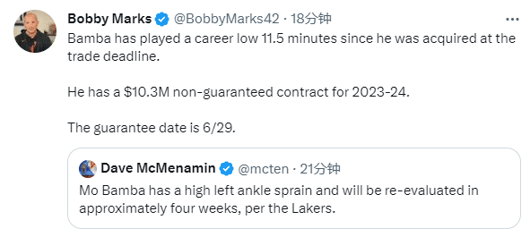 此外,班巴的合同中2023-24赛季薪水为1030万美元,该金额为无保障,薪水保障日期为北京时间今年6月30日。