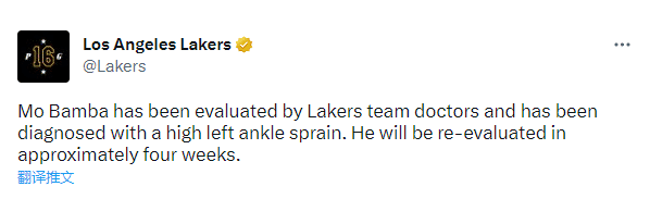 在湖人对阵勇士的比赛中,班巴遭遇左脚踝扭伤,因伤提前退出比赛,并且因伤缺席上一场与灰熊的比赛;如今班巴的伤势检查结果出炉,惨遭左脚踝高位扭伤,至少伤停4周,由于湖人本赛季常规赛将在4月10日结束,因此预计班巴将因伤常规赛报销。