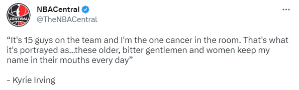 “还有一些帖子在那问,‘欧文为何离开勒布朗?欧文为何离开塔图姆?欧文为何离开杜兰特?’有问有答,头头是道。就好像除了比赛的那三个小时,我生命中每天剩余的21小时不存在一样。”