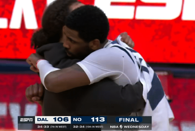 鹈鹕惊险取胜,赛后欧文拥抱麦科勒姆等人,并且把球衣送给别人,独行侠输球后战绩变成34胜33负,已经从西部第5掉到西部第7位(若快船击败猛龙,独行侠将掉到西部第8位);鹈鹕32胜34负战绩追平湖人,继续排在西部第10位;值得一提的是,勇士躺赢升到西部第5位。