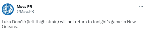 下半场,东契奇因左大腿拉伤退出比赛,欧文第三节明显发力,单节独砍12分扛起独行侠进攻大旗,末节,欧文带队疯狂反扑,欧文轰进不讲理3+1,再加上贝尔坦斯和伍德输送火力,独行侠12-0追到3分,之后CJ-麦科勒姆火力输送,连续3记三分太狠,连得13分太疯狂,38秒欧文轰进救命三分,欧文强投三分打铁不中,无奈最终仍输掉比赛。
