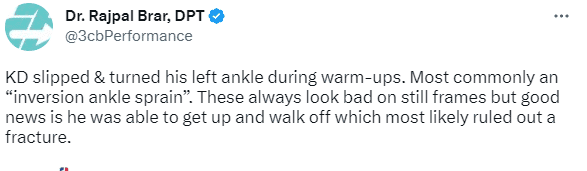 究竟杜兰特的伤势如何?医学专家Rajpal Brar表示,杜兰特的脚踝内翻扭伤,看起来很糟糕,不过好消息是能够站起来走路,这应该可以排除骨折的可能性。