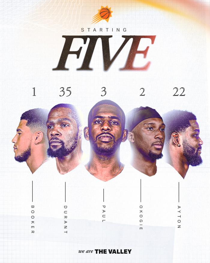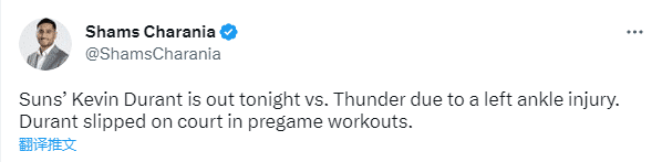 本来太阳已经把杜兰特列入首发阵容,首发五虎依旧是杜兰特、保罗、布克、艾顿和奥科吉,可赛前开打前15分钟,太阳宣布杜兰特因左脚踝酸痛而无法出战,本来今天战旧主雷霆应该是杜兰特太阳生涯主场首秀,因伤退出比赛,太阳主场首秀被迫延迟。