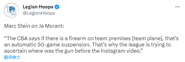 对于莫兰特持枪事件,名记Marc Stein表示:NBA劳资协议规定,如果有人在球队场地内(包括球队专机)上携带枪支,就会被自动禁赛50场。这就是为什么联盟在努力确认枪支的来源。