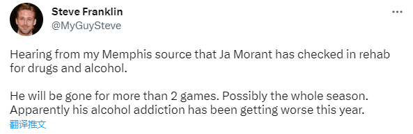 有人爆料莫兰特已经在康复中心接受了毒品和酒精检测,他已经被禁赛2场比赛,可能缺席整个赛季,今年他的酒瘾越来越大。