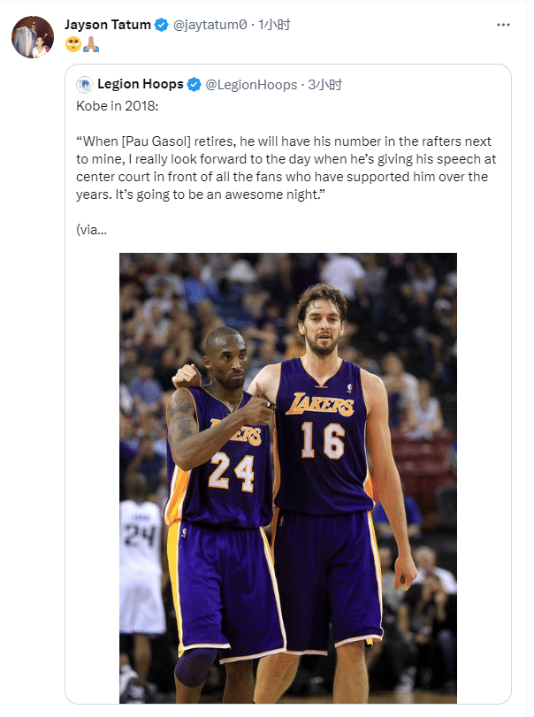 值得一提的是,科比5年前言论被挖出,在2018年时,湖人传奇球星科比-布莱恩特曾说:当保罗-加索尔退役时,他的号码会悬挂在我的号码旁边的椽子上,我真的期待有一天他在球场中央面对所有多年来支持他的球迷发表演讲。这将是一个了不起的夜晚。