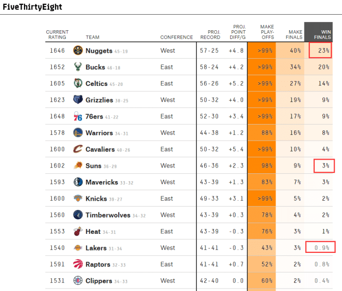 根据FiveThirty Eight的最新预测,掘金夺冠概率为23%,雄鹿夺冠概率20%,掘金和雄鹿各自排在东西部第一名,夺冠概率位居联盟前二;76人夺冠概率9%、卫冕冠军勇士夺冠概率为8%,太阳和独行侠3%,湖人队仅有0.9%;换言之,五大流量球队的夺冠概率并不高。