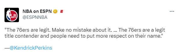 各大名嘴心目中的总冠军得主各不相同,名嘴帕金斯表示:当我看到哈登和恩比德所拥有的接管比赛能力时,我意识到这支球队真的很棒,我真心认为他们是本赛季总冠军的有力争夺者;在谈论本赛季争冠第一梯队时,我认为人们应该给76人多些尊重,他们刚刚击败了雄鹿,终结了对手的16连胜。所以不要再只提雄鹿和凯尔特人,76人也应该被放入讨论。