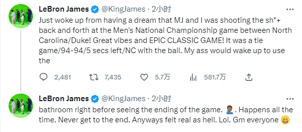 今天詹姆斯发推引热议,自曝梦境,发推写道:我刚刚从一个梦中醒来,我梦见我和迈克尔-乔丹在北卡对阵杜克的NCAA总决赛中对飙。球场氛围太棒了,我们也演绎了一场史诗般的经典比赛。比赛最后还剩五秒的时候打成了94-94,北卡的球权。