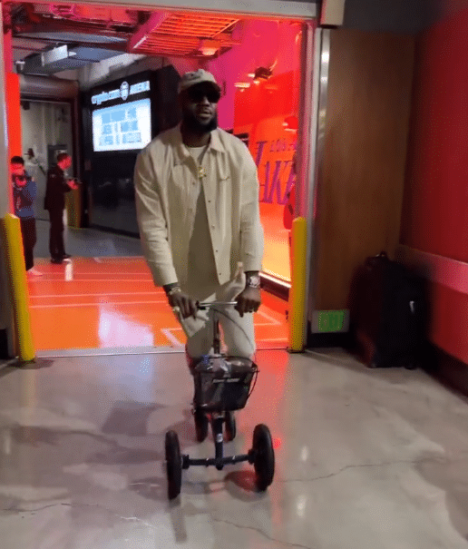 湖人大战勇士赛前,詹姆斯身穿白色长裤、白色外套并且戴着白色外套亮相,仍旧穿着保护靴并且跪在小三轮上走路,借助工具单腿行走的速度很快,整个人的精神状态很好,嘴巴里还说着:拐角,拐角。
