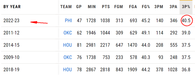 三分命中率超四成!哈登迎来外线最准一季:生涯首冠就在今年?