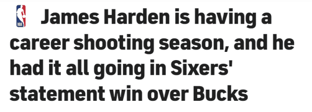 距离第四节结束还有1分23秒时,76人还落后4分,哈登在24秒进攻时限快到时超远三分出手命中。这是相当关键的一个进球,也是哈登本赛季三分高效表现的缩影。