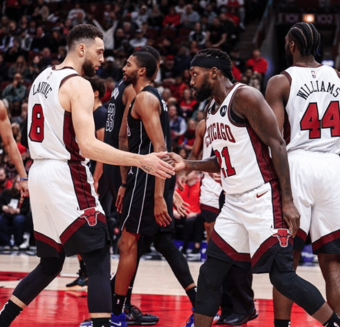 下半场,贝弗利第三节快速长传,卡鲁索反击大踏步上篮得分,两大湖人旧将连线,进攻端,贝弗利造犯规两罚全中,公牛继续扩大领先,单节34-22又赢12分,三节打完公牛已经领先46分,篮网全队三节仅仅拿到51分。