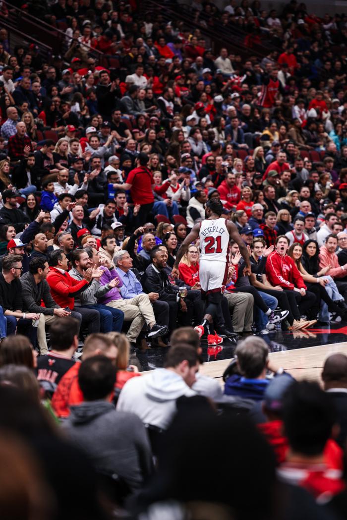 末节11分04秒,公牛领先50分,德罗赞带队打了一会后提前打卡下班,拉文、贝弗利等主力都不再上场,三节打卡,贝弗利直接坐在地板上观战,并且和球迷开怀热聊,最终公牛稳稳拿到一场大胜。