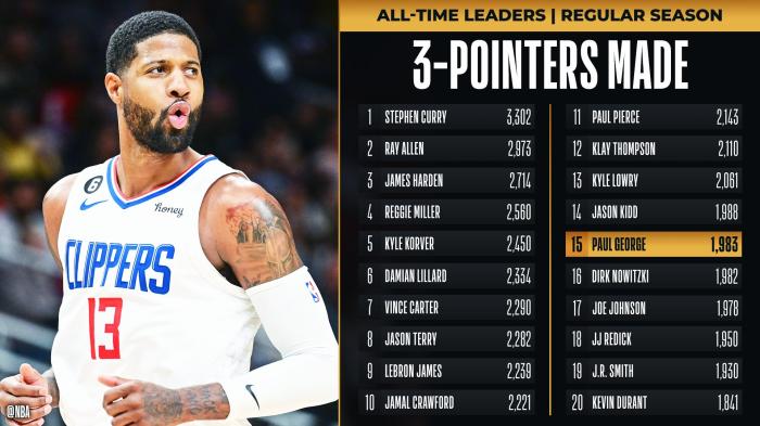 值得一提的是,乔治生涯三分命中数正式超越诺维斯基升到历史三分榜第15位。