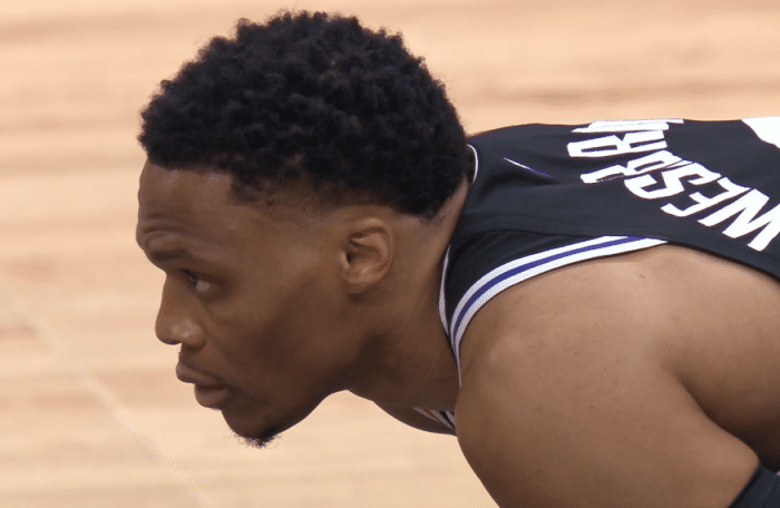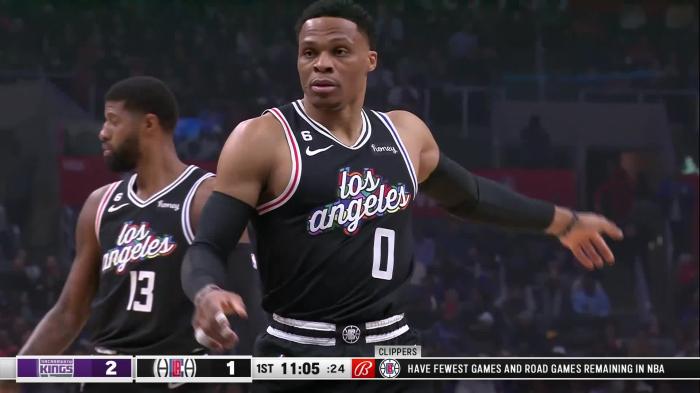 威少身穿快船深色0号球衣出战,两队跳球后,小莫把球传给威少,威少控球过半场,乔治第一攻打铁不中,11分05秒,威少强突造犯规两罚全中,拿到快船生涯首分,现场为他欢呼;随后威少串联队友,助攻小卡轰进三分,助攻普拉姆利打成2+1。