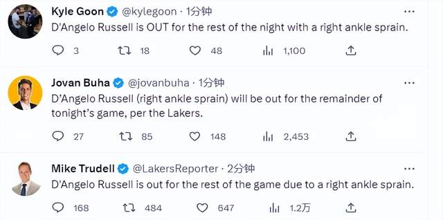 从慢镜头来看,拉塞尔的崴脚程度并不严重,毕竟不是落地时,身体的压力没有施加到脚踝上。但即便对于职业运动来说,崴脚后总归需要一段时间进行恢复,至少会花费7-10天。虽然不是很长时间的缺阵,但对于湖人来说,他们却可能无法承受这样的损失。因为剩余的比赛每一场对于他们都非常重要。主帅哈姆在赛前还表示,希望全员都能出战剩余所有赛事,即便是背靠背也不例外。但没有想到,湖人出师不利。