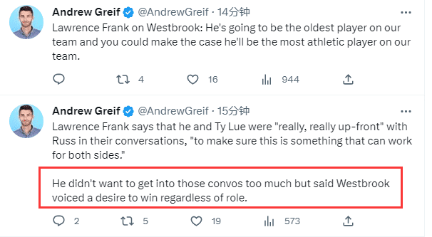 劳伦斯-弗兰克透露,他和泰伦-卢非常非常坦率地和威少谈话,确保这是对双方都有效的事情;威少不想过多第参与会谈,但威少表态他愿意在球队中扮演什么角色,他想赢球,他想成为快船队的一员,他想帮助球队。