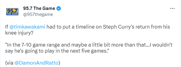勇士记者Tim Kawakami报道,库里距离复出还得7-10场比赛的范围,也许比这多一点,我认为他接下来五场比赛不会上场。