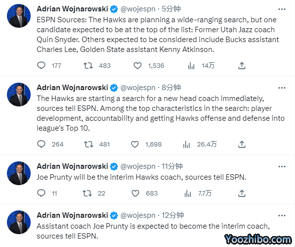 来源:JRS直播网02-22 10:52JRS直播网讯02月22日讯 ,篮网和主教练沃恩续约多年,但老鹰主帅正式下课,据名记woj报道,老鹰已经解雇主帅麦克米兰,球队助教乔-普朗蒂预计将成为球队代理主帅;新帅潜在候选人有前爵士主帅斯奈德(头号候选人)、雄鹿助理查尔斯李,勇士助理肯尼-阿特金森。