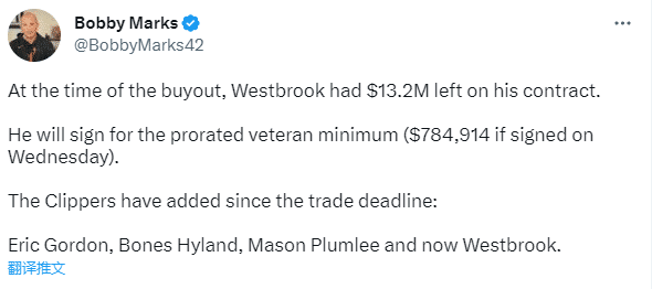 NBA薪资专家Bobby Marks跟进报道,威少的合同买断金额为1320万美元。他将与快船签下一份老将底薪合同,约为78.5万美元。