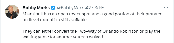据薪资专家Bobby Marks报道,签下乐福后,热火仍有一个开放的阵容位置,并且他们仍然有很大一部分的中产特例可用。他们可以选择将双向球员奥兰多-罗宾逊转正,也可以等待另一个出现在买断市场的老将。