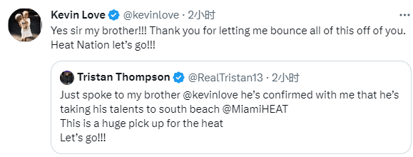 名记报道乐福将签约热火,特里斯坦-汤普森发推写道:刚刚和我的兄弟乐福聊了,他向我确认,他正在将他的天赋带到南海滩。热火绝对捡到大便宜了。冲啊,兄弟!