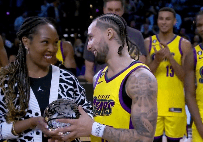 现场先是颁发冠军奖杯,全队都摸一下,之后凭借出色的表现,鹈鹕老六夺得今年新秀挑战赛MVP,决赛阿尔瓦拉多4投2中拿到5分并且终结比赛。