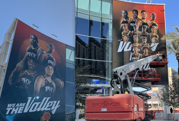 太阳巨幅海报就在球馆大门的两侧,另一侧是太阳四巨头的宣传海报。