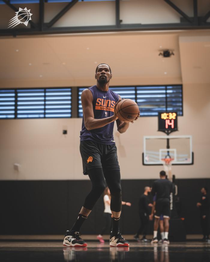杜兰特身穿太阳训练服,在太阳助教的陪练下训练投篮,投篮状态依旧很好;全队训练之后,杜兰特和布克、保罗一起加练罚球;保罗想要拿球去罚球时,杜兰特长臂抢断一幕太有趣,KD上篮不进后把球传给保罗,后者开始罚球。