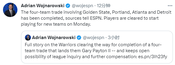 来源:JRS直播网02-14 14:27JRS直播网讯讯02月14日,勇士四方交易正式达成,据名记woj报道,勇士、活塞、老鹰和开拓者四方交易正式达成,明天涉及交易的球员就可以为新东家登场比赛;怀斯曼改穿13号,预计将在明天迎来活塞生涯首秀,小佩顿因伤预计将缺席大部分常规赛,暂无复出时间。