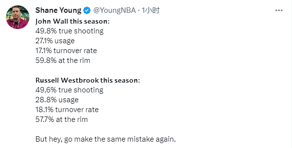 另外,NBA知名分析师Shane Young不希望快船引援威少,因为威少和沃尔的数据相似,发推写道:嘿,(快船)别再犯同样的错误。