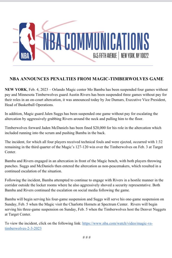 NBA官宣冲突罚单:班巴禁赛4场损失28万 里弗斯禁赛3场4人被罚