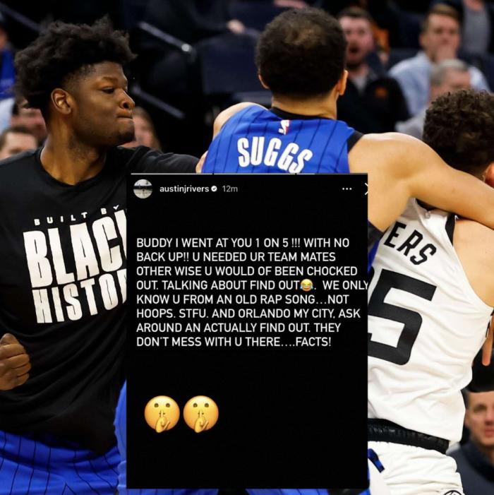 被驱逐后班巴发声约架,小里弗斯则强硬回应:兄弟,我1个人冲上去干你们5个,没有任何支援。你需要队友的帮助,否则你会被我干趴下。我们只在一首RAP歌曲里听说过你的名字,而不是打球。闭嘴吧!奥兰多是我的城市,,你去打听打听,他们不会搭理你......事实!