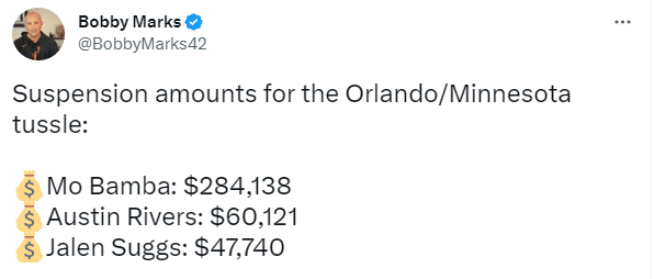 针对魔术和森林狼火爆冲突事件,NBA官方追加罚单,本赛季小里弗斯场均5.5分1.8篮板1.4助攻,年薪是291万美元;普林斯场均8.5分2.4篮板,年薪710万美元;麦克丹尼尔斯场均11.3分3.8篮板2助攻,年薪216万美元;班巴场均7.3分4.6篮板,年薪1030万美元;萨格斯场均9.2分3.7助攻2.8篮板,年薪692万美元。