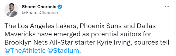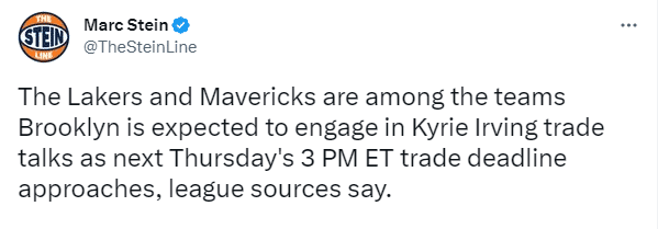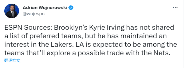名记Marc Stein跟进报道,随着交易截止日临近(2月10日),预计湖人与独行侠会与篮网就欧文交易进行商谈;shams则报道湖人、太阳和独行侠都有意追求欧文。